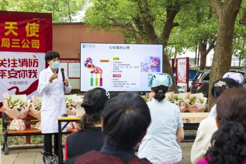 5月12日,在第111个国际护士节当天,中建三局三公司联合武汉市第三医院开展“‘汉’卫生命、携你同行”主题活动,走进社区,为社区居民、工友讲解医疗急救、防疫知识并开展义诊活动,为他们办力所能及的实事。