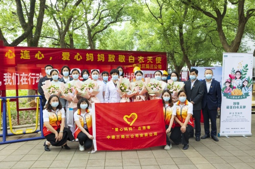 在武汉市东湖高新区铁基山小区,中建三局三公司的青年志愿者为正在做义诊的武汉市第三医院医护团队献上精心准备的鲜花和美好的祝福。5月12日,在第111个国际护士节当天,中建三局三公司联合武汉市第三医院开展“‘汉’卫生命、携你同行”主题活动,走进社区,开展志愿服务活动。