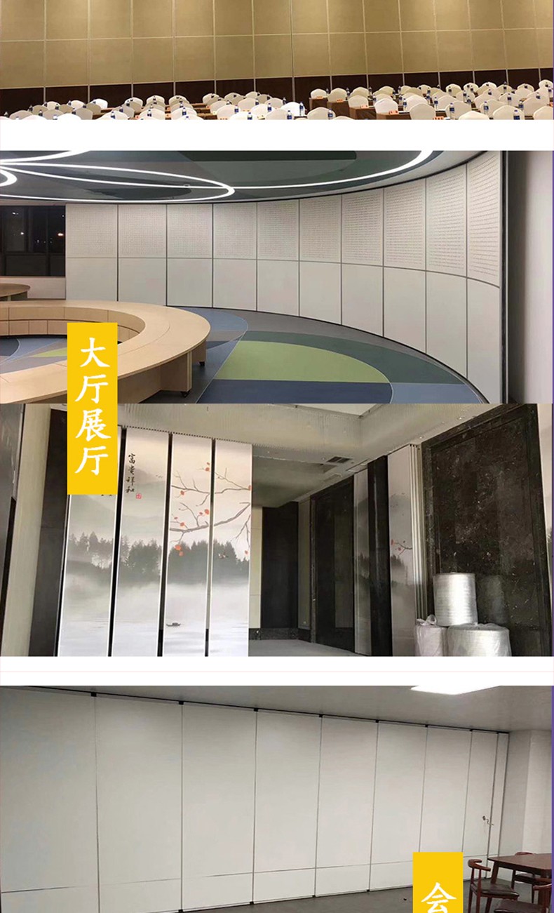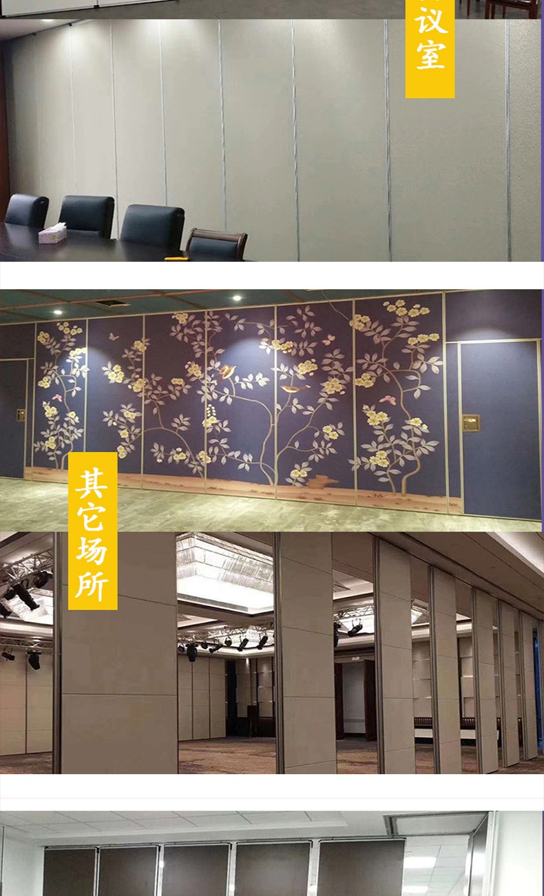 2、活动隔墙板由高硬度铝合金为框架,高强度的钢制骨架、橡胶、隔音棉及饰面板组成。
